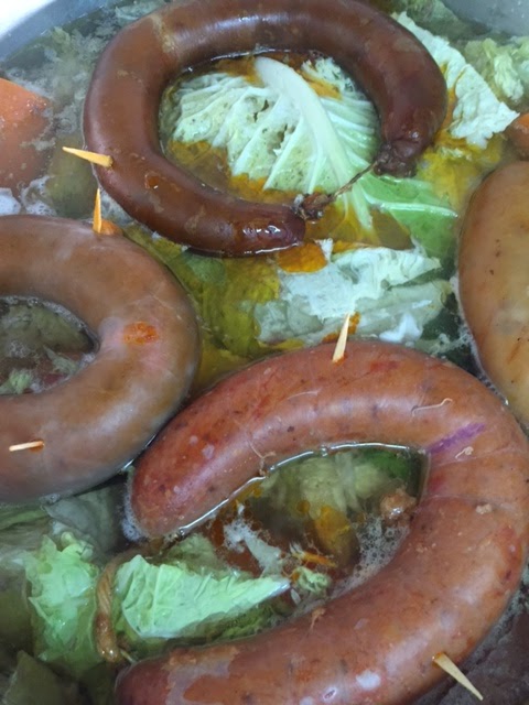 Chouriços certificados ponho sempre um de cada: Alentejo, Minho e Trás-os-Montes (de bísaro). As farinheiras são raianas, da Guarda (com uns laivos de canela) e também de Estremoz. O paio é de Garvão. Os nacos de presunto fumado são do Minho. Entra sempre também um ou dois chouriços mouros do Fundão. E como as "santas" se habituaram a isso desde a sua juventude, enfio também umas chouriças frescas de sangue e vinagre (que eu bem dispensaria porque não lhes vejo valor gastronómico, a não ser para espevitar o arroz do cozido).